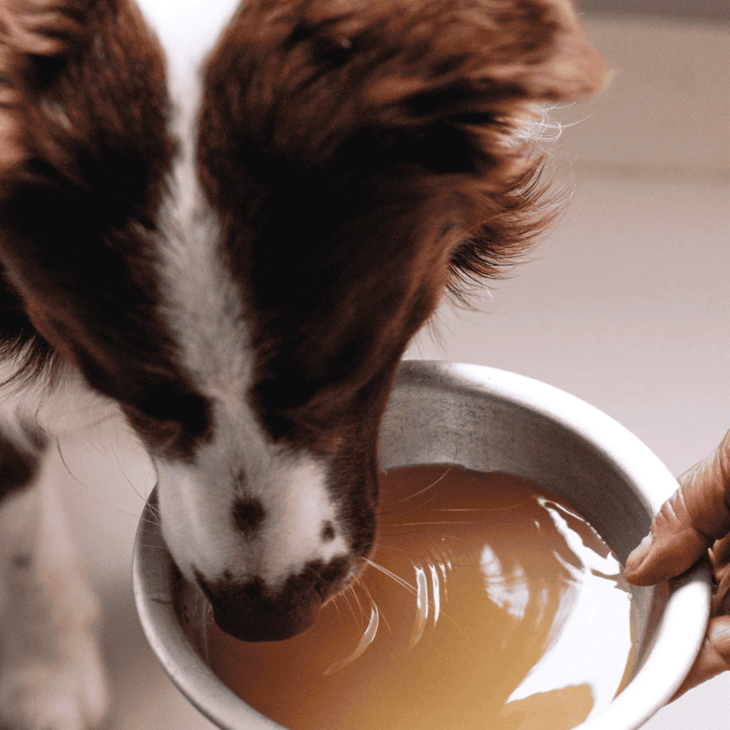 Composto por ossos bovinos e vinagre de maçã. O caldo é rico em glicina e glucosamina, portanto, benéfico para a saúde das articulações, da pele e do pelo. Tem propriedades reparadoras da mucosa gastrointestinal, por isso é muito indicado para animais que estão em recuperação, fazendo uso de medicamentos ou que estejam passando por desconfortos gástricos. Contudo, o consumo hídrico é o principal benefício deste produto.
