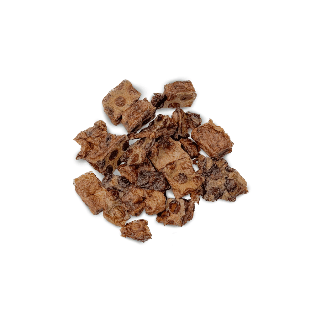 Petisco 100% natural, feito com ingrediente de origem animal e desidratado lentamente em temperatura controlada garantindo maior durabilidade e conservação do produto sem uso de químicos.
