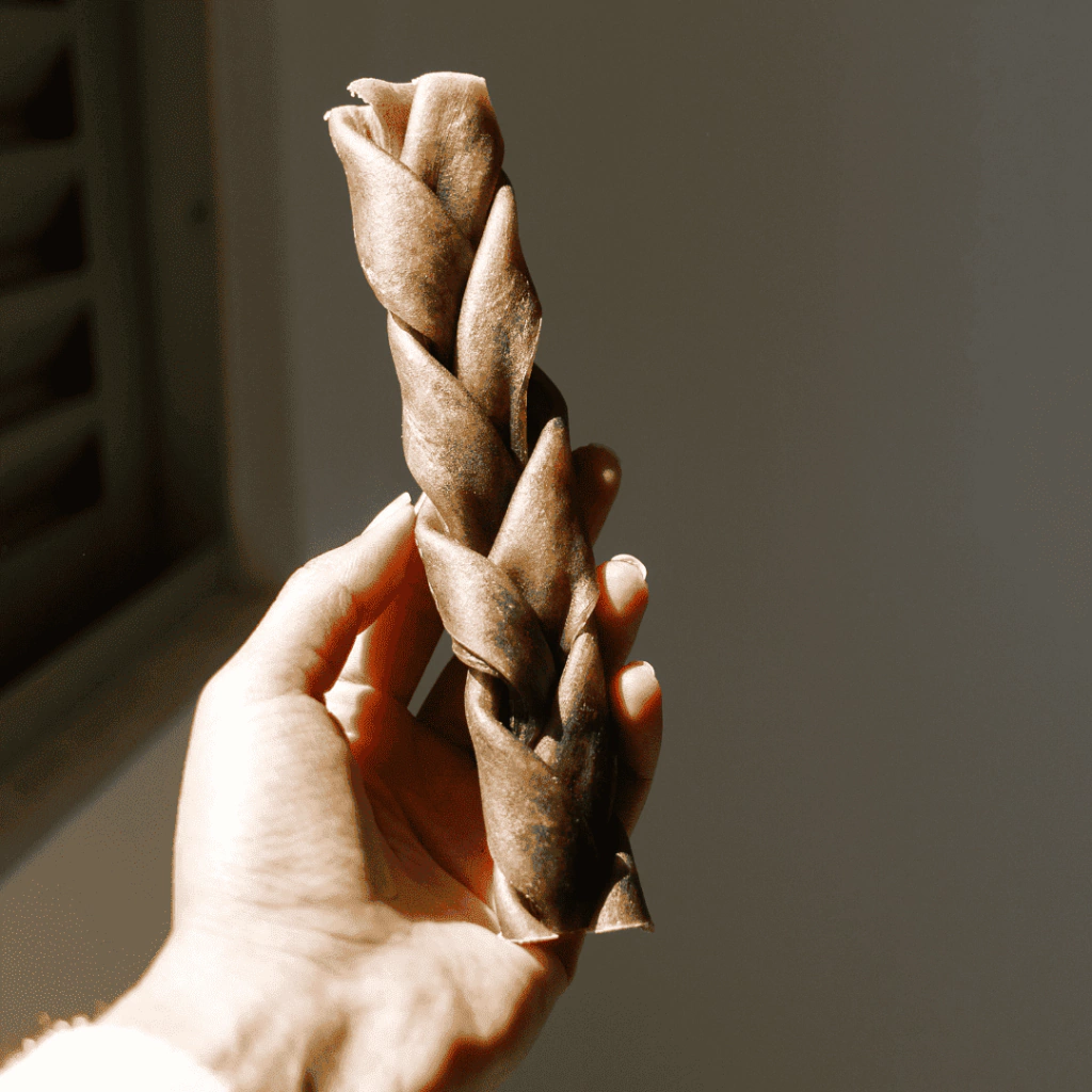 Trançado com 3 tiras de pele de boi sem pêlos, um dos mastigáveis mais resistentes da linha.